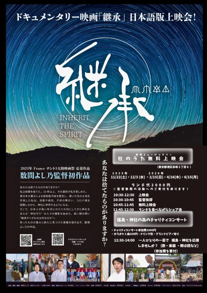 明日がもう今日になってしまいました! 11/22・12/3は赤坂 杜のうた様にて 10:30-12:30映画継承の上映会! ランチ代2000円   午後は 12:30-14:00 福島と神社の為のチャリティーコ